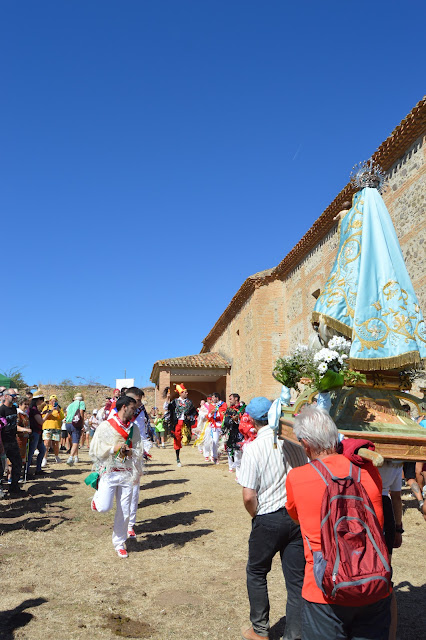 En El Olmo, con el sermón del Cahiburrio quienes no podrán acompañar a la Virgen de Ayago se despiden de ella, continuamos la Romería. y saludamos a los vecinos de Bascuñana.