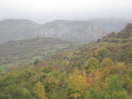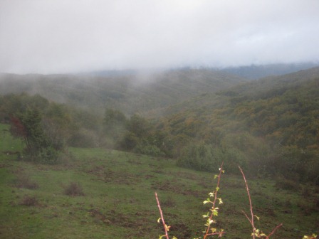 El ascenso comienza a endurecerse, a una curva la sigue otra curva ¡esto no tiene fin! y seguimos a oscuras. Casi en la cima comienza a clarear, es un amanecer espeso con las nubes rozando las copas de los arboles. Y el mundo comienza a ampliarse, no mucho, pero ya veo las hayas y pinos que intuía en el ascenso. Son casi las ocho y media de la mañana.